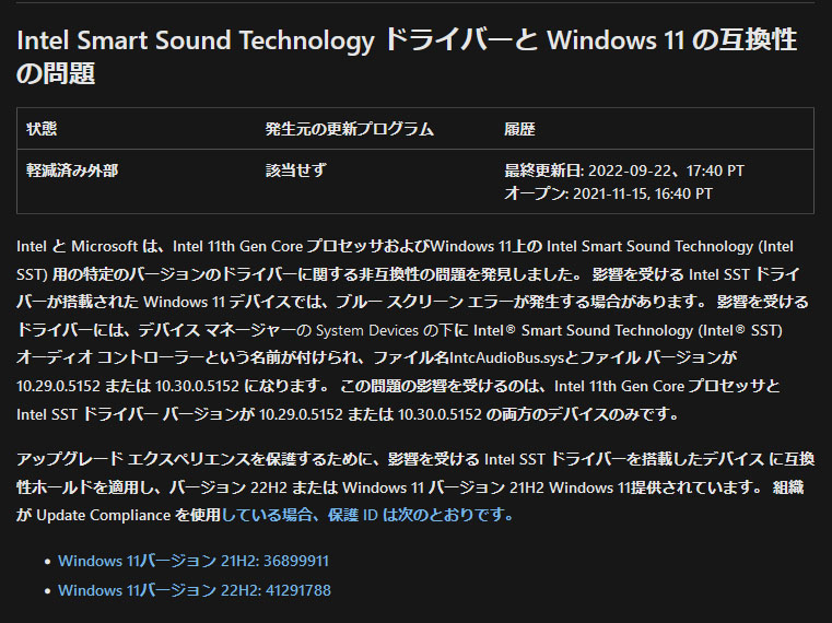 Windows 11、Intel製音声ドライバでブルースクリーン発生の不具合