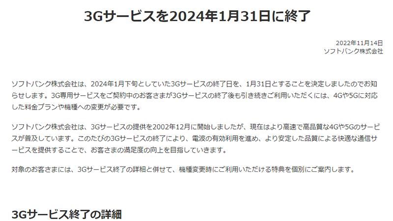 ソフトバンク、3Gサービスを2024年1月末で終了
