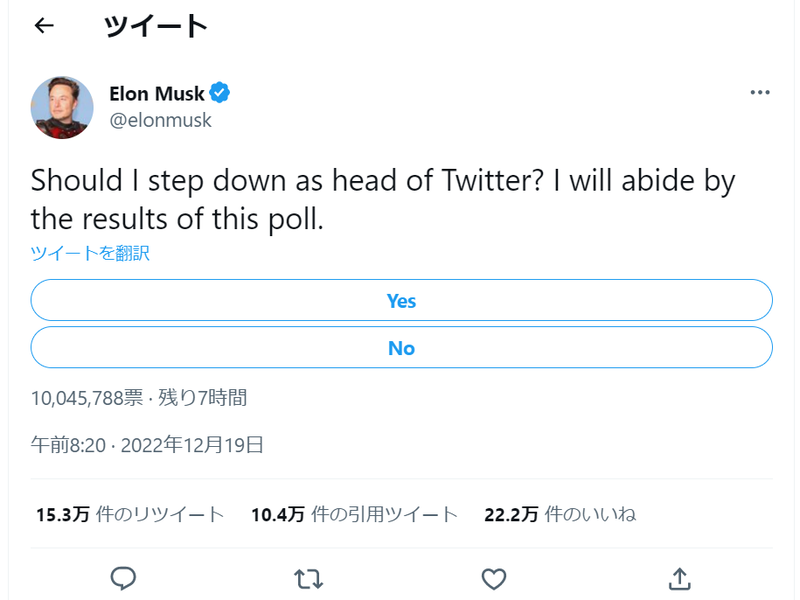 マスク氏「TwitterのCEO辞任すべき?」自身で投票開始