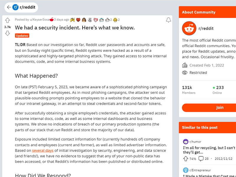 Redditに不正アクセス。メールアドレスや暗号化済みパスワードなどが漏洩