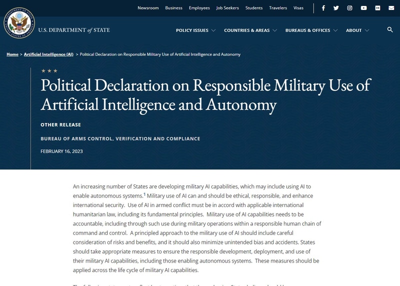 米国務省、AIや自律システムの軍事利用に政治宣言