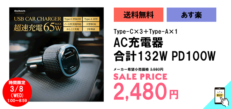 • シガーソケットから65W出力できるUSB Type-C充電器、オウルテックから