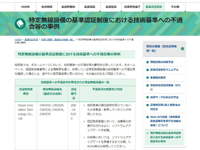 CHUWIの一部PCが5GHz帯技適未取得で総務省が行政指導。アップデートで対応予定