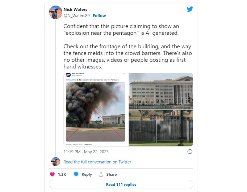 「ペンタゴン付近で爆発」のAI生成フェイク画像、Twitterで拡散
