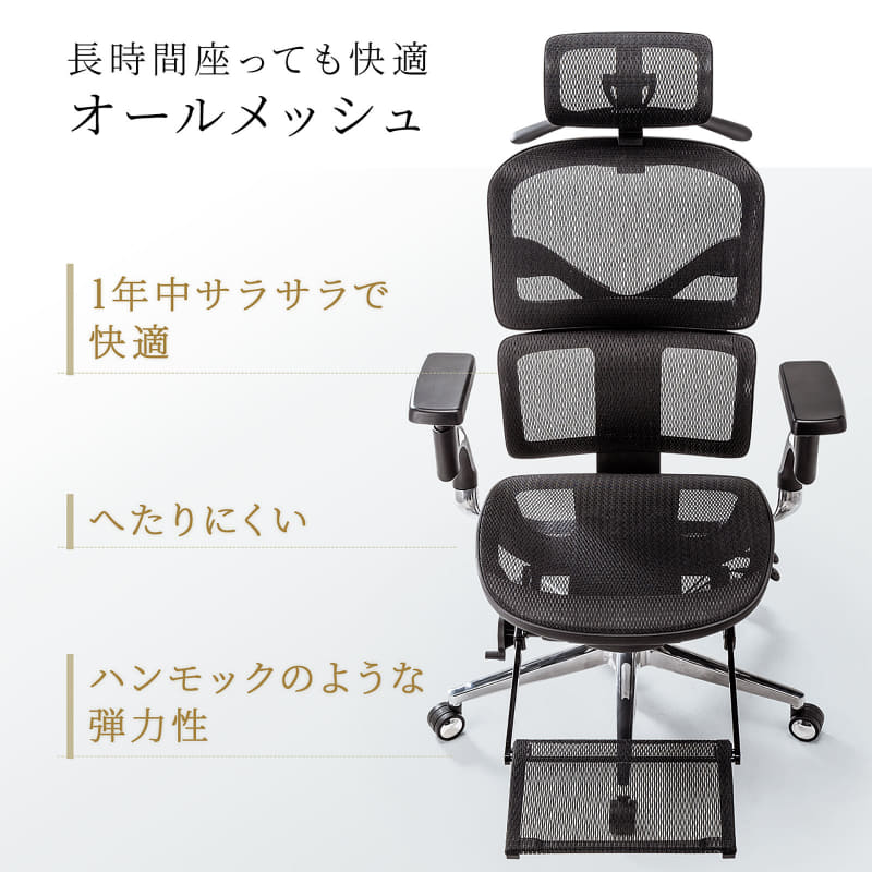 • サンワサプライ、リクライニングやオットマンを備えたオールメッシュチェア