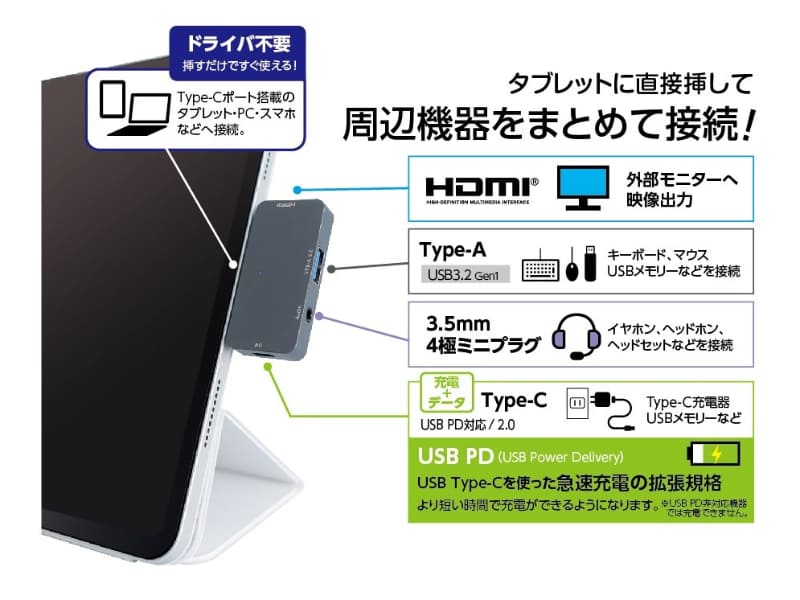 ナカバヤシ、USB Type-C/A変換アダプタ付きの4in1ドック
