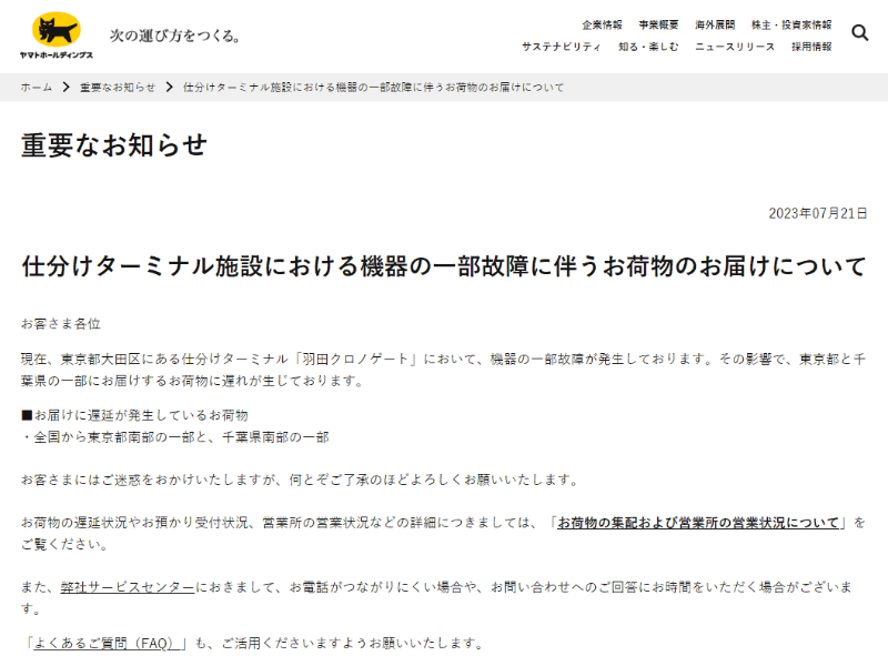ヤマト運輸、東京と千葉の一部で配送遅延。仕分け施設の機器故障で