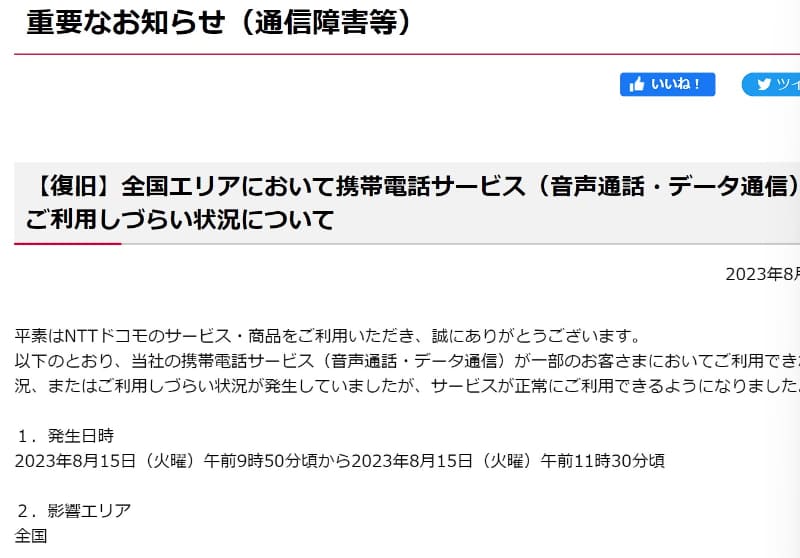 ドコモ通信障害が復旧。ただし台風の影響で大阪など一部地域で障害