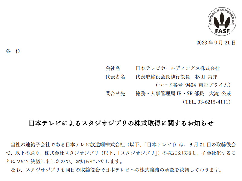 日本テレビ、スタジオジブリを子会社化