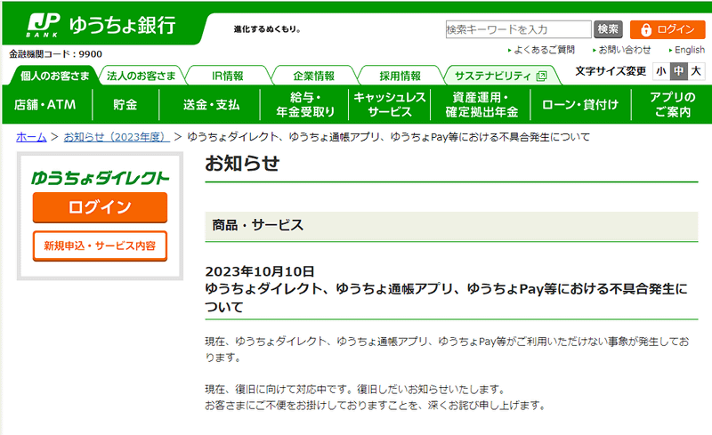 「ゆうちょ通帳アプリ」「ゆうちょダイレクト」が使えない不具合発生中