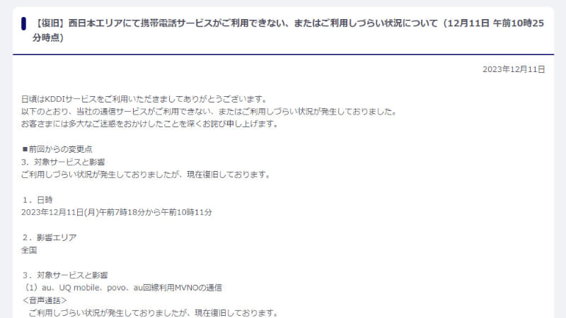 auやpovoなどの通信障害が復旧。約3時間に渡り利用しづらい状況に