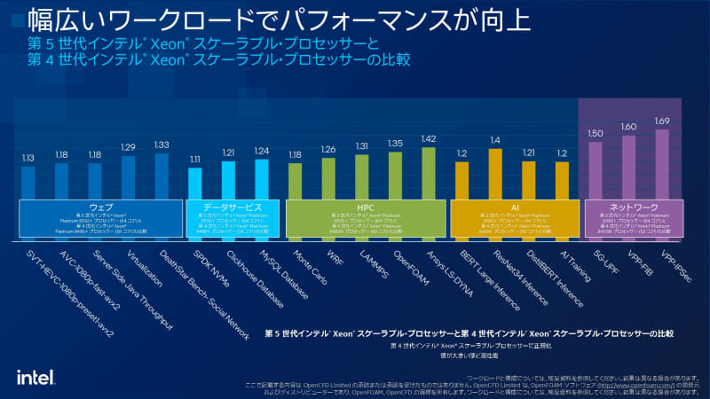 AI性能や電力効率重視の「第5世代Xeon」、前世代やEPYCと比較しても優位