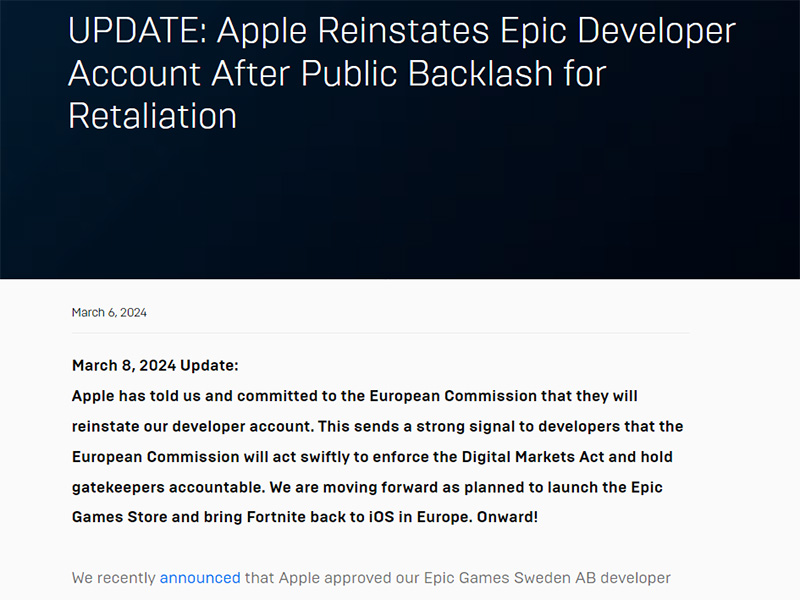 Apple、Epicの開発者アカウントを復活