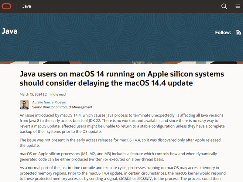 macOS Sonoma 14.4適用後にJavaがクラッシュする不具合。回避策なく、OS更新の延期を