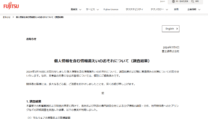 富士通、個人情報を含む情報など流出の可能性。3月のサイバー攻撃で