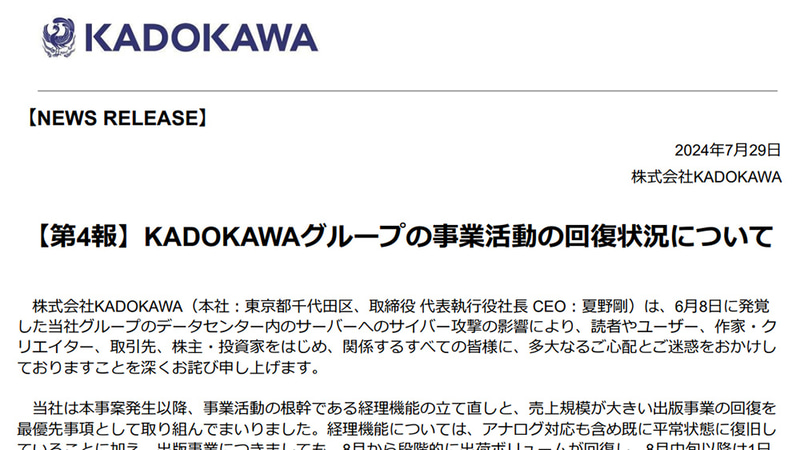 KADOKAWA、出版事業は8月中旬以降におおむね回復