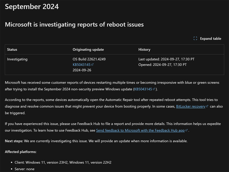 9月度Windows更新で、再起動の繰り返しやブルースクリーンなどの不具合
