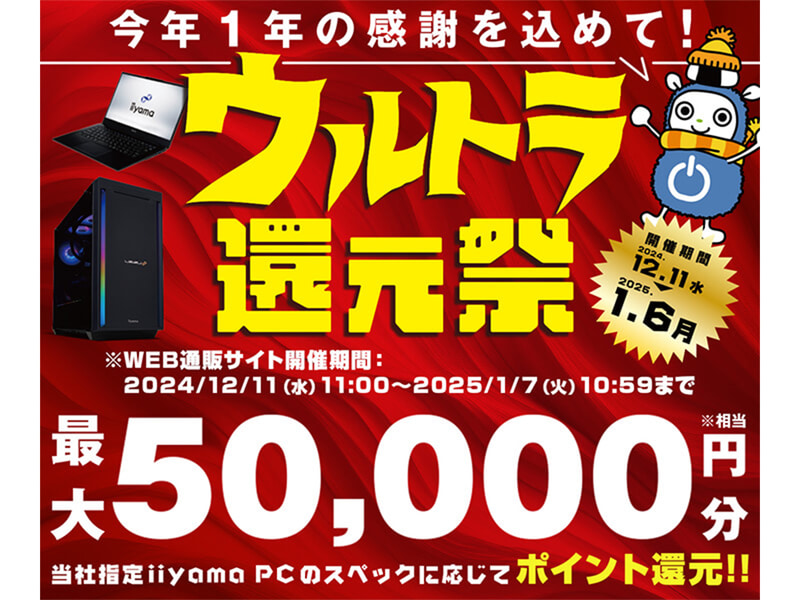 パソコン工房、対象iiyama PC購入で最大5万円相当が還元される「ウルトラ還元祭」