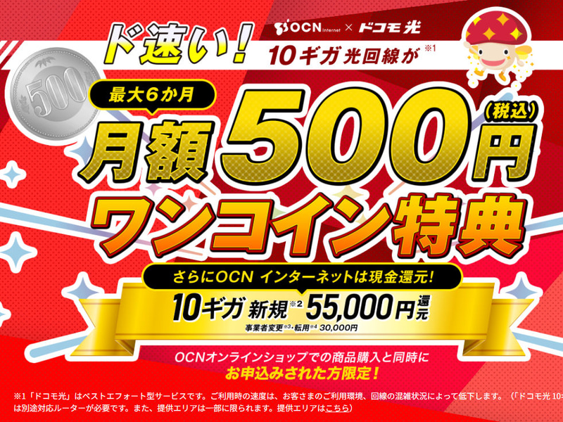 OCN、ドコモ光10ギガ契約で5万5,000円還元中!月額料金も半年500円に