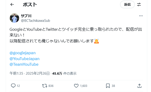 人気プロゲーマー立川氏、YouTube、Twitch、Xアカウントを立て続けに乗っ取られる