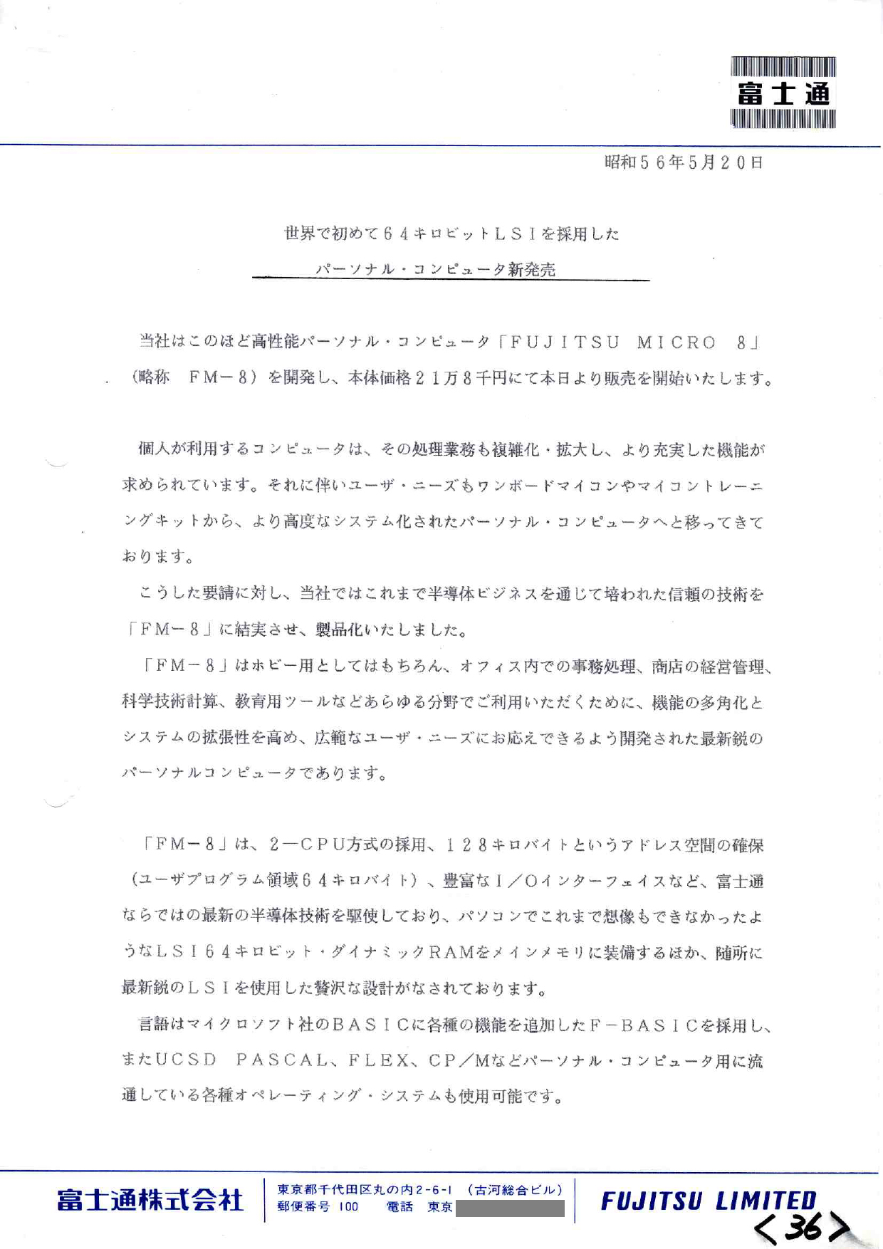 ニュースリリースで振り返る、時代を築いたPCたち【富士通編 LKIT-8~FM-8】