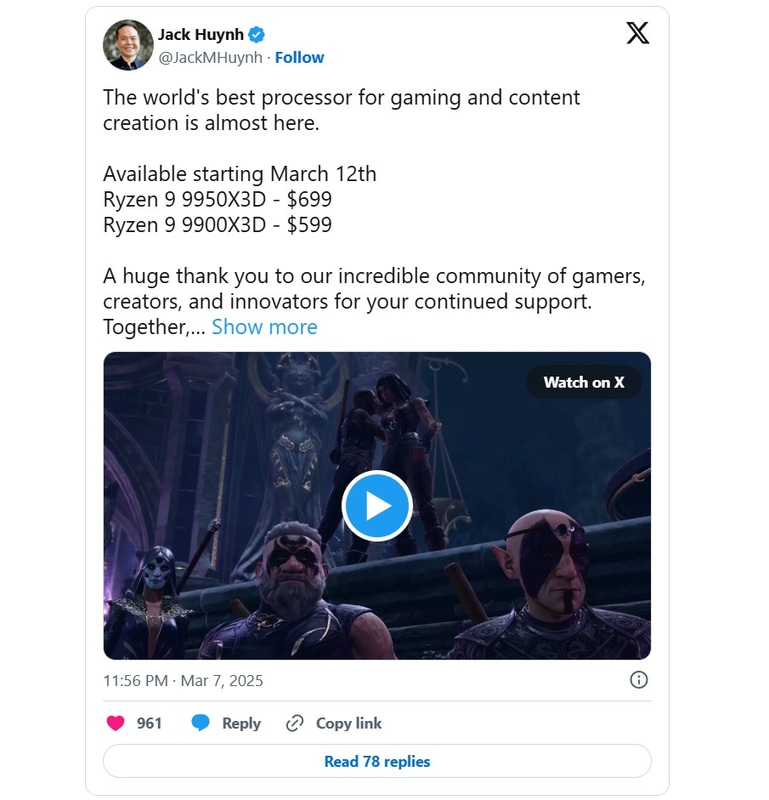16コア/128MB L3キャッシュ搭載の「Ryzen 9 9950X3D」、発売日決定