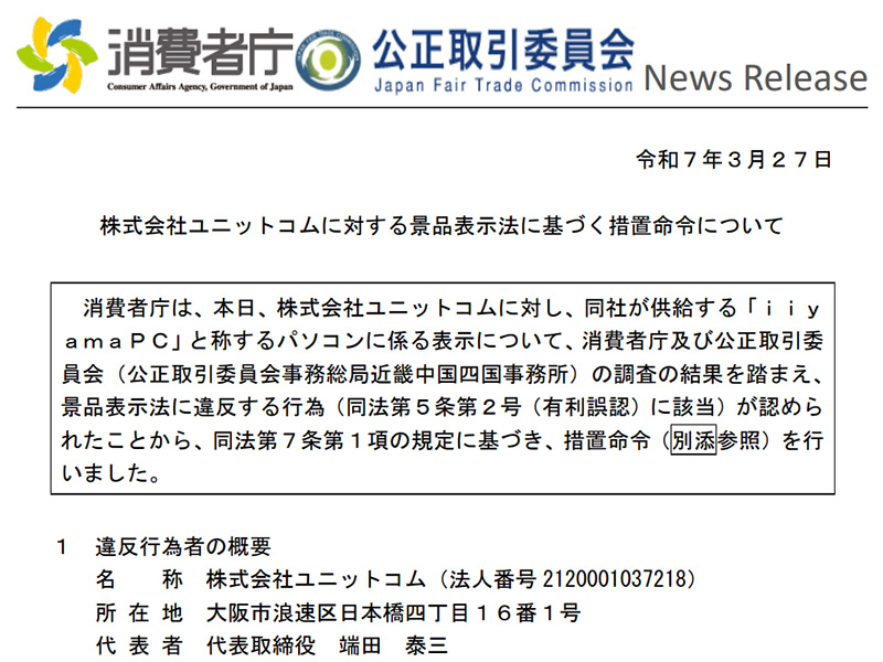 消費者庁、景品表示法違反でユニットコムへ措置命令