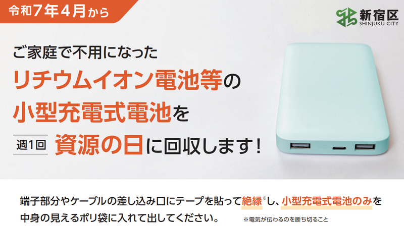 新宿区、充電池を家庭ゴミとして回収開始。モバイルバッテリも対象