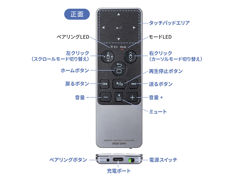 サンワサプライ、タッチパッド付きのリモコン型Bluetoothマウス