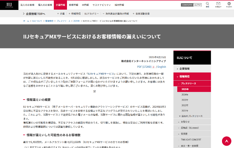 IIJ、サイバー攻撃で407万件以上の顧客メールアカウント情報が漏えいの可能性