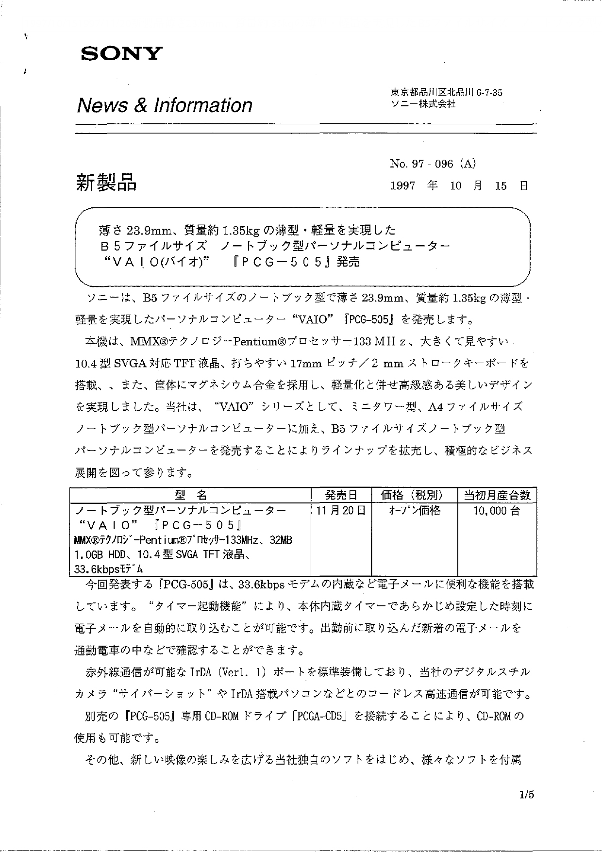 ニュースリリースで振り返る、時代を築いたPCたち【ソニー編 SMC-70~VAIO PCG-505】