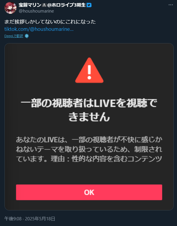 宝鐘マリンさん、TikTok LIVEで配信開始早々に性的コンテンツ判定を受ける