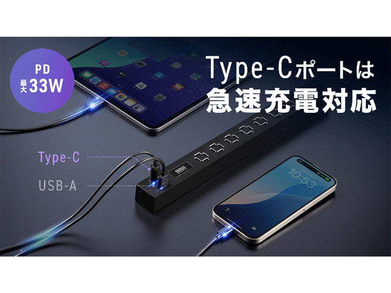 サンワサプライ、クランプ固定式のUSBポート付き電源タップ