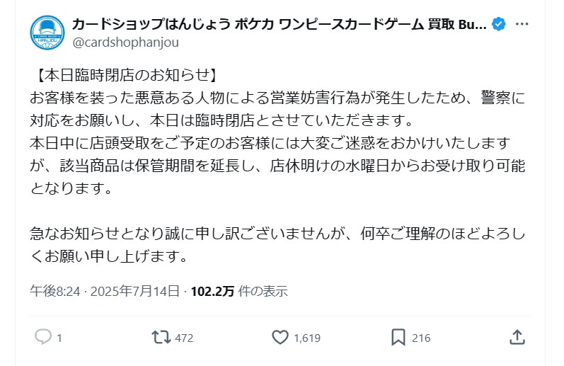 ストリーマーのはんじょうさん経営のカードショップで迷惑行為。警察沙汰に