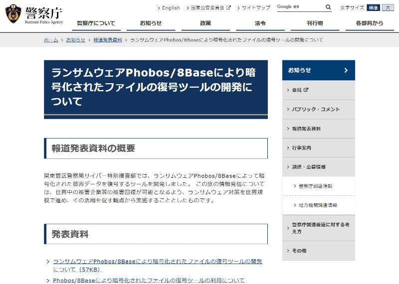 警察庁、ランサムウェア復号ツールを公開。Phobosと8Baseに被害対応