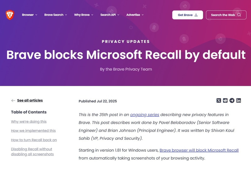 ノーサンキュー。Webブラウザ「Brave」はWindowsリコール機能を標準でブロック