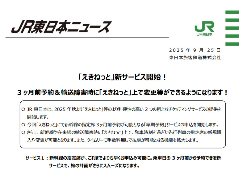 えきねっとで3カ月前からの早期予約が10月から開始。運休・遅延列車チケットの新規購入や予約変更も可能に
