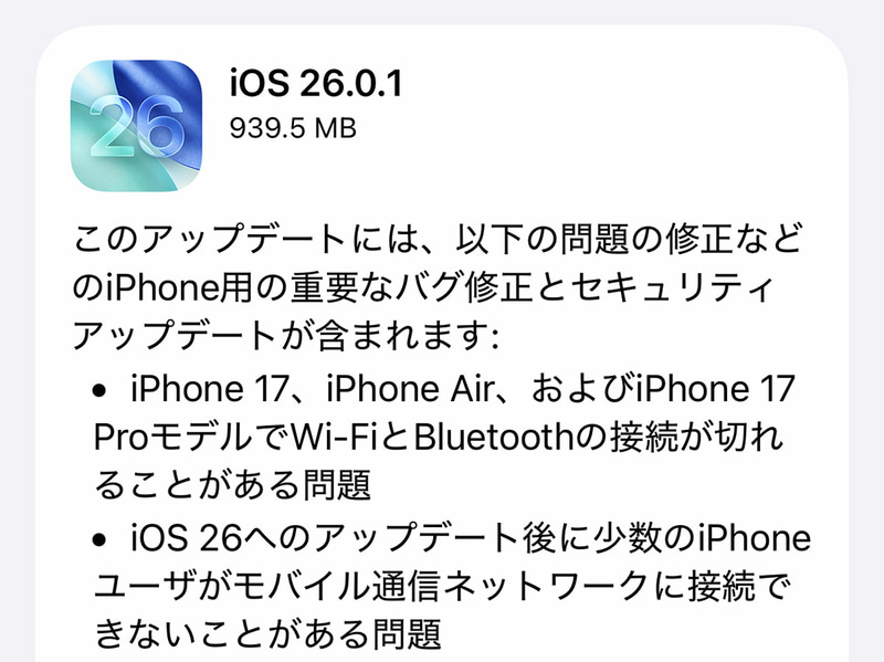 iPhoneでWi-Fiが切れる不具合を修正した「iOS 26.0.1」公開