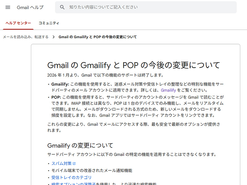 Gmail、POPのサポートを年内で終了