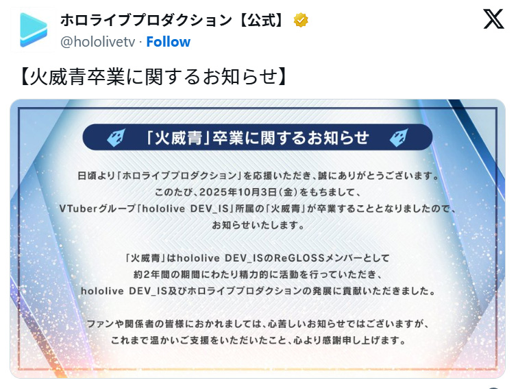 ホロライブの火威青さんが卒業。3月から活動休止中