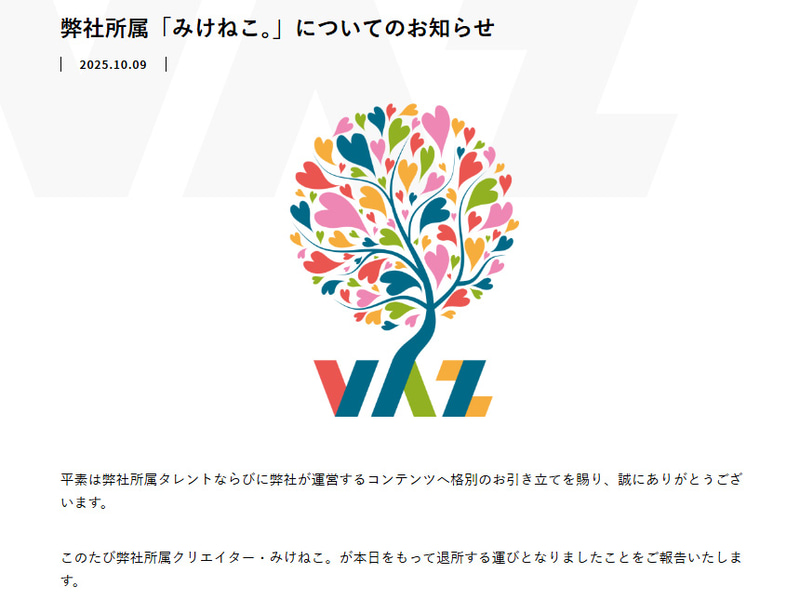 Vtuberのみけねこ。さん、心身の健康上の問題で事務所を退所