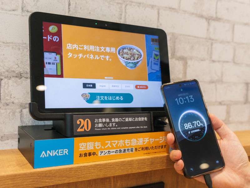 牛丼を食べながらスマホを充電。Ankerが吉野家客席に充電ケーブルを設置