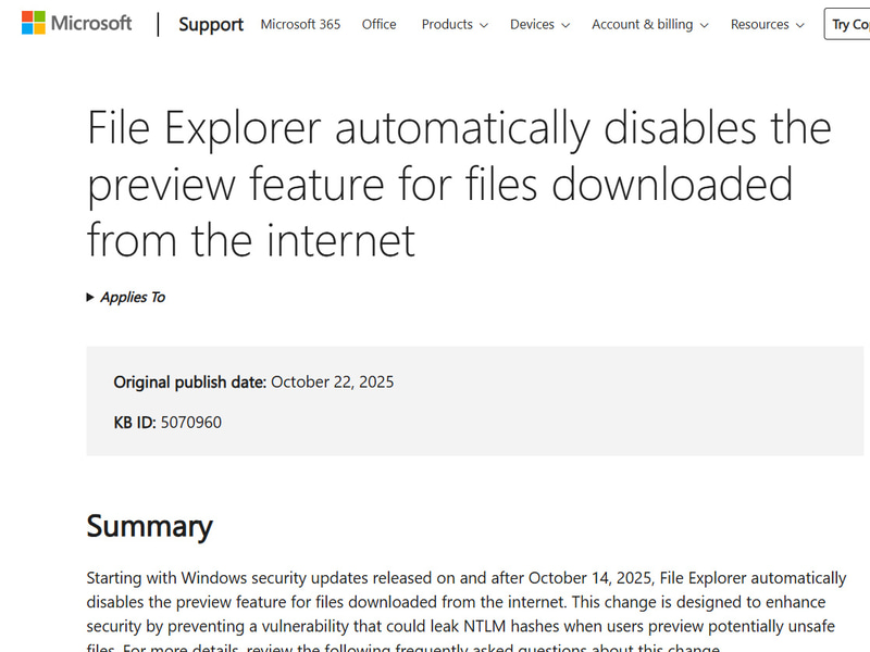 エクスプローラーのプレビュー機能を一部制限。ダウンロードしたファイルが対象