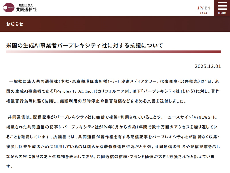 共同通信加盟の48社がPerplexityの「ただ乗り」に抗議。誤情報拡散も指摘