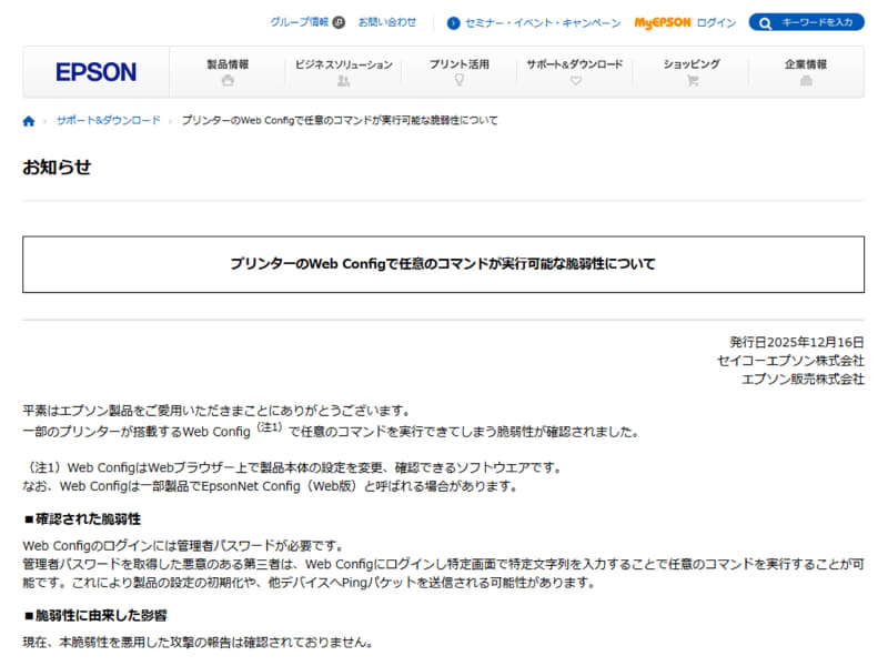 約5年間気付かず。エプソン販売、システム不備で問い合わせに未回答