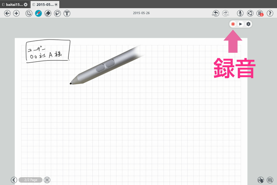 Surface Pro 3のMetaMoJi Noteを起動し、ボイスレコーダー機能をオンにし、相手の意見を画面上にメモしながら、話を進めていく。
