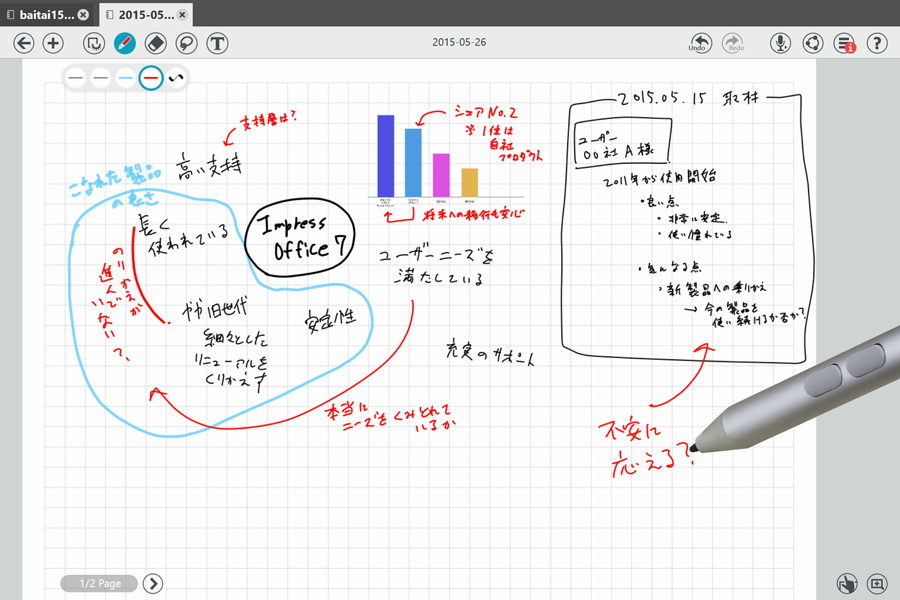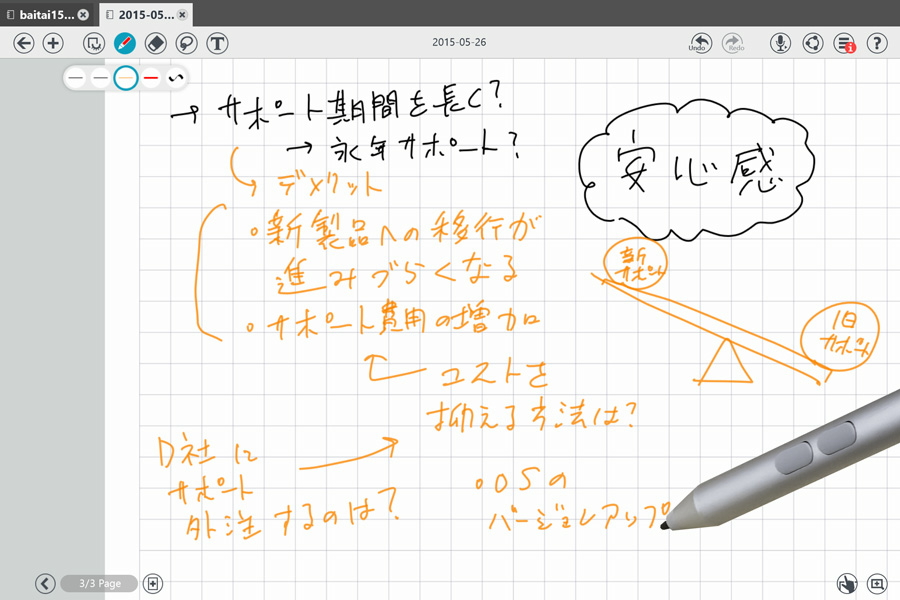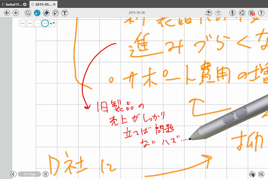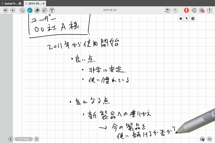 当初のメモに追加するように、上司からのアドバイスを書き込んだMetaMoJi Noteの画面は、今や書き込むスペースがないほど。